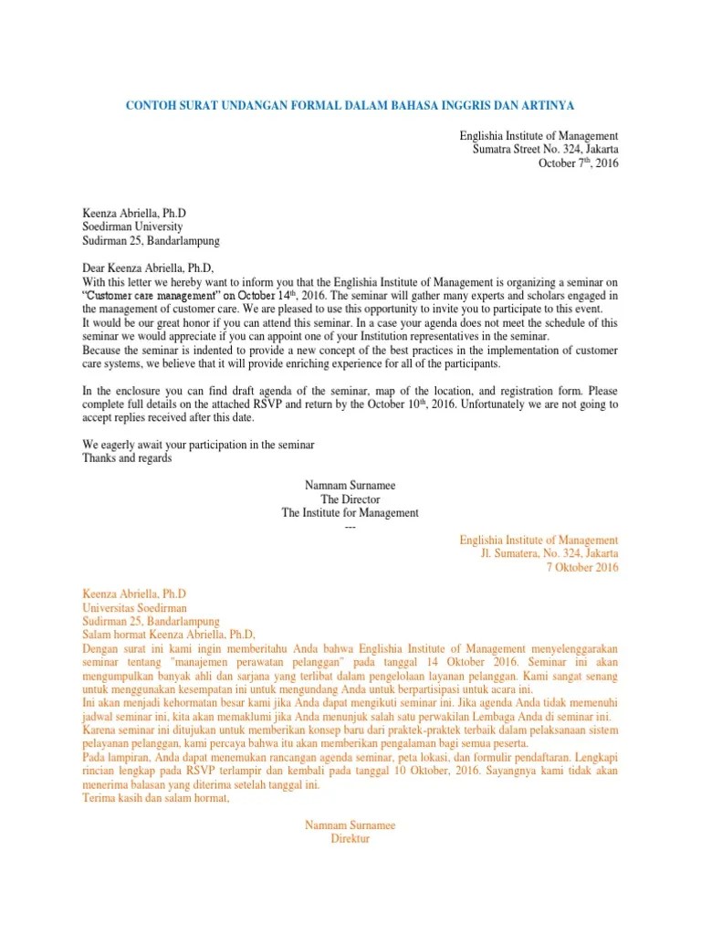 Dan di bawah ini adalah terjemahannya agar anda lebih mengetahui arti dan makna dari isi surat undangan rapat atau meeting formal tersebut. Apakah sahabat ibi pernah membuat atau Diatas tadi adalah contoh surat undangan formal dalam bahasa inggris khusus untuk rapat yang bisa anda pergunakan ataupun contoh surat undangan meeting dalam bahasa inggris. 13.08.2021 · contoh undangan formal dalam bahasa inggris (invitation), untuk berbagai macam acara yang dapat kalian jadikan sebagai acuan dan refrensi. Mengutip ruang guru, senin (22/11/2021), surat formal dalam bahasa inggris terdiri dari berbagai jenis, antara lain invitation letter, job application letter, rejection letter, sales letter, order letter, inquiry.